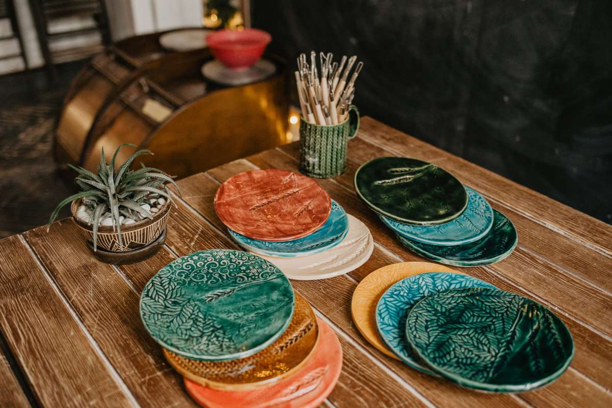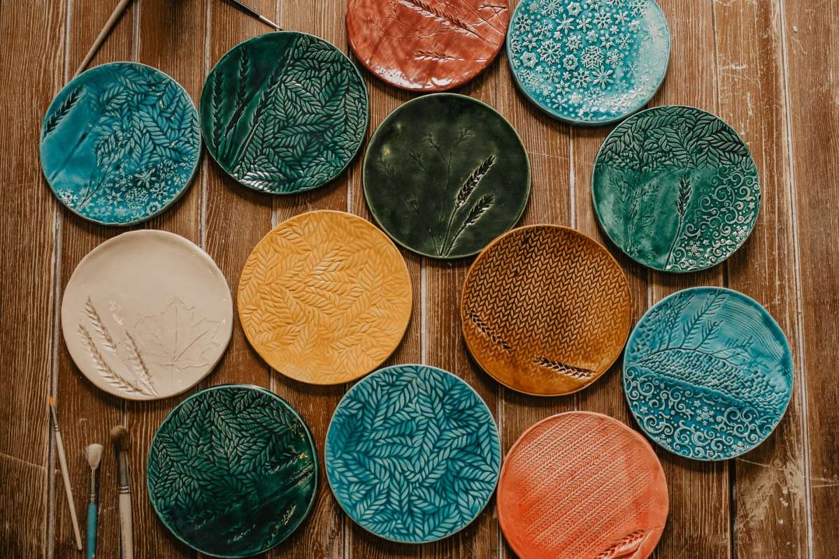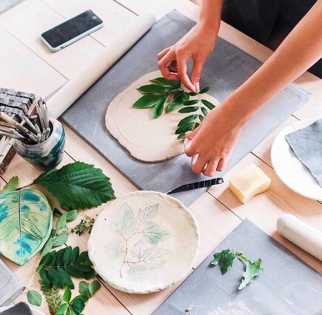 Мастер-класс очень простой, но 2 часа пролетают незаметно. Для того, чтобы сделать одну тарелку, нужно вначале от души простучать кусок глины, раскатать его ровно и тонко, тщательно проверить на возможные пузырьки воздуха. Потом загладить с двух сторон специальной пластинкой. Дальше самое творческое и интересное - придумываем узор, отпечатываем листья, кружева, штампики, фигурные скалки, все, что пожелаете!