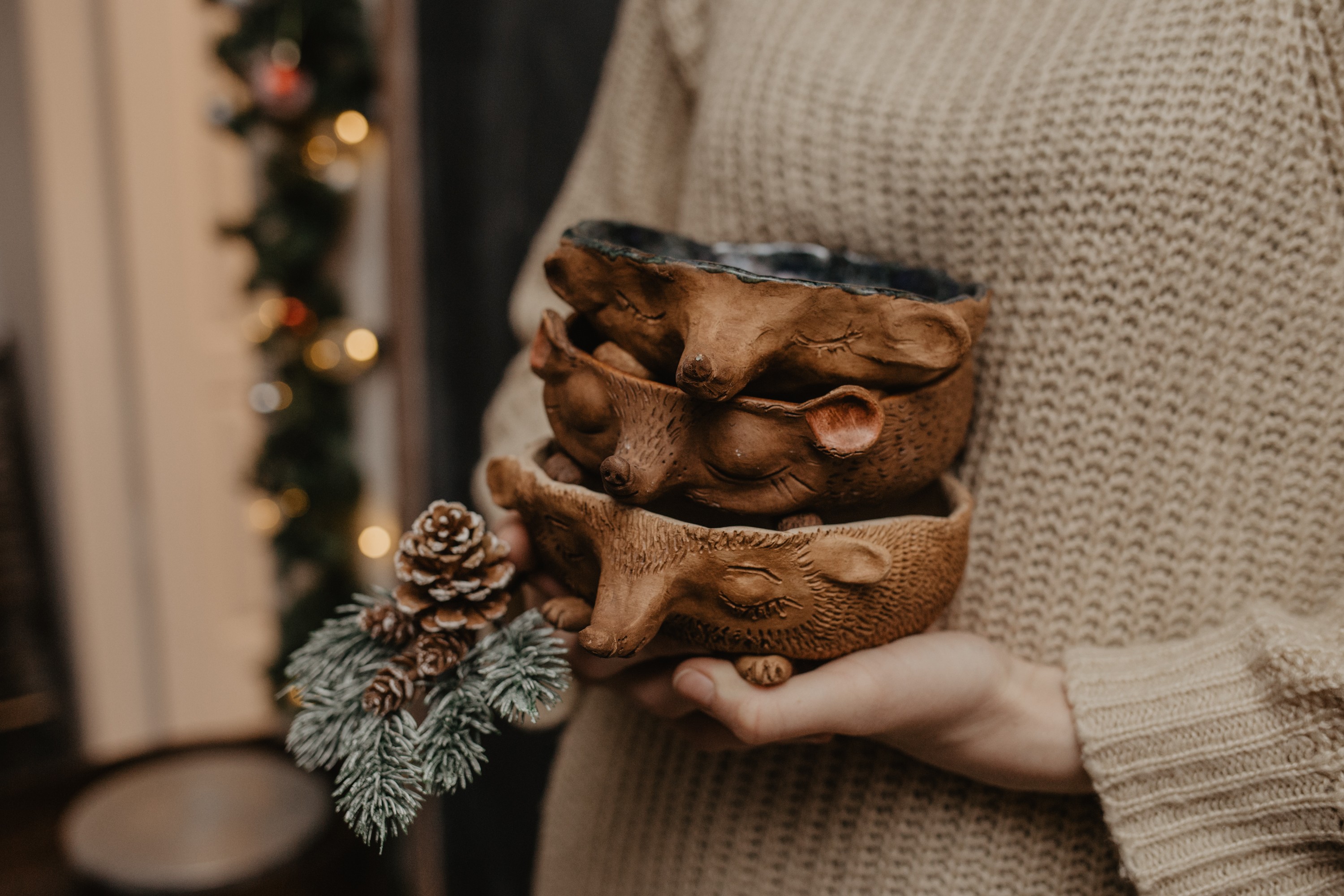 Ежики - это ручная лепка. Вначале разминаем шар глины в мисочку, затем лепим детали: ушки, нос, лапки, хвостик. Затем немного скульптурной магии - делаем веки, скулы, все тщательно разглаживаем, чтобы мордочка получалась более натуральная. И даже закрытые глаза выглядели как настоящие. Далее приклеиваем лапки и хвост.